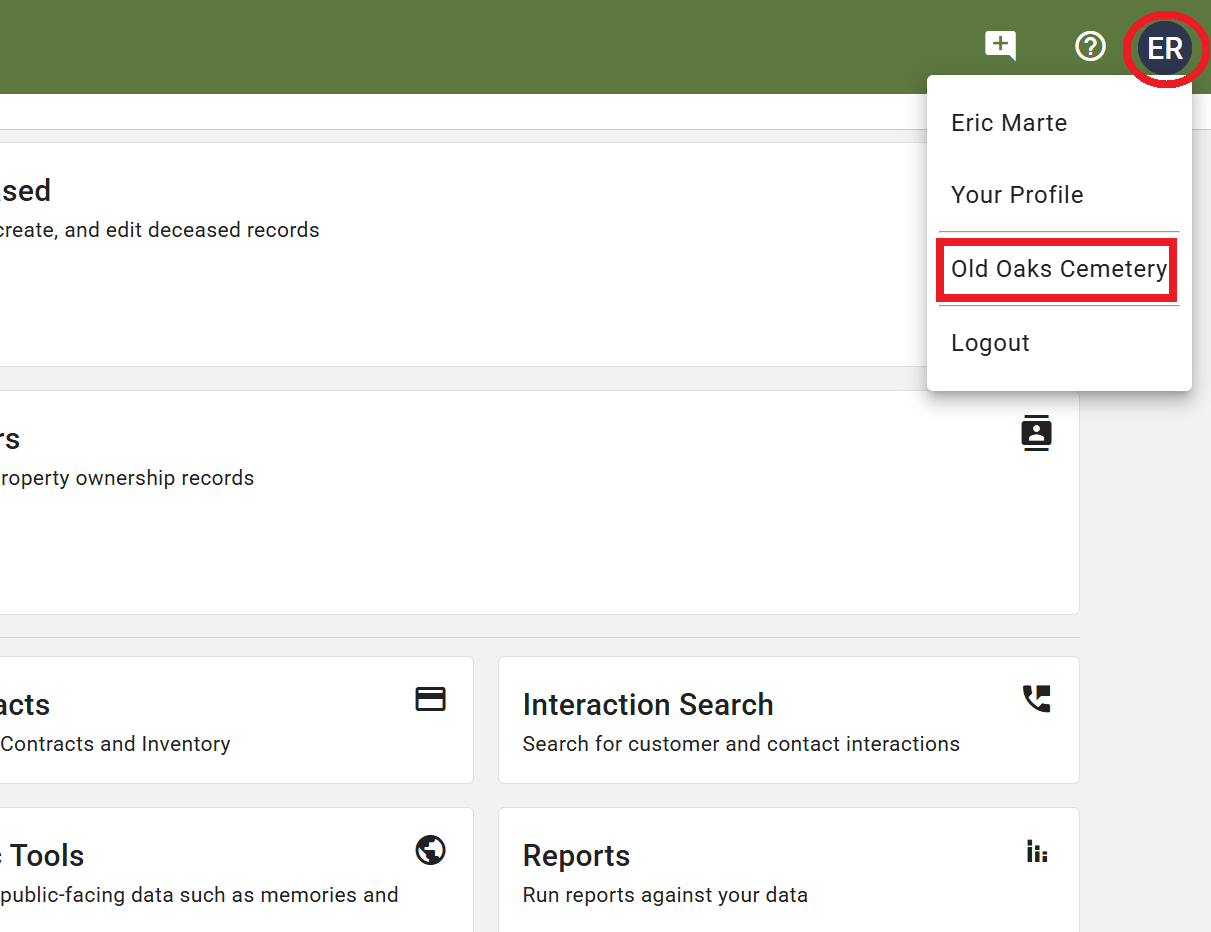 Click your profile button on the top right corner of the screen, and select your cemetery name: