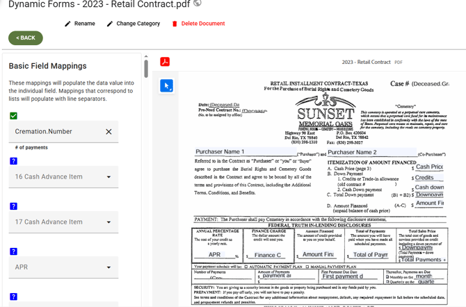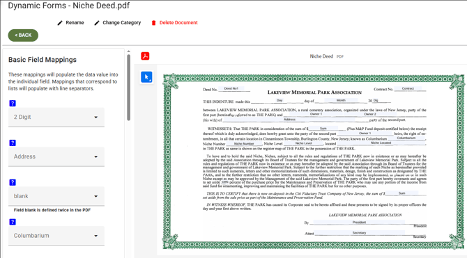 One by one, go through each field and match your fillable field title to a webCemeteries field title. For instance, CemeteryName is the PDF's field title and Cemetery.Name is the title in webCemeteries Management.