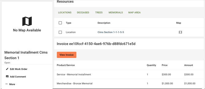 - In the Work Order, you'll see the details that you entered in Step 3. Any property that you linked to the Invoice will be added as a Resource to the Work Order, and you will see the Invoice information under the Resources Section: