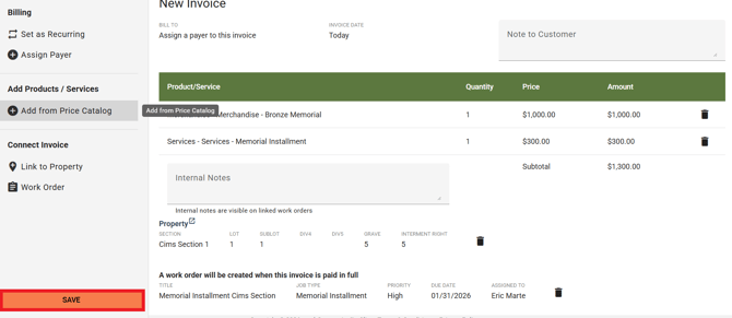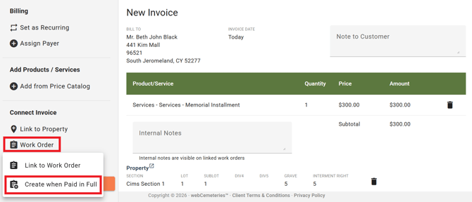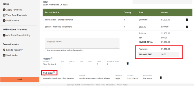 Once created, the Invoice will need to be Paid in Full before the Work Order will be created. Apply payments to the invoice, and once fully paid, the Work Order will be created.