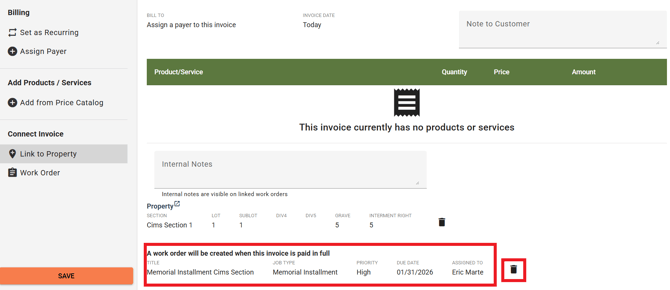 - You can remove the Work Order to be created by selecting the Trash bin Icon