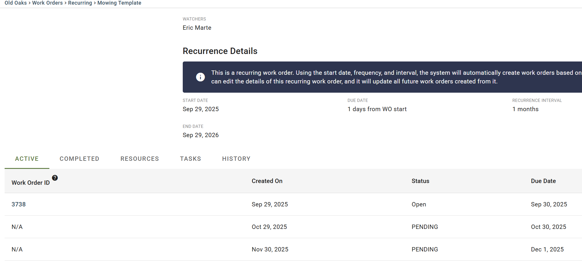 Use the tabs to quickly check progress, adjust resources, or update tasks to keep recurring work orders accurate and effective.