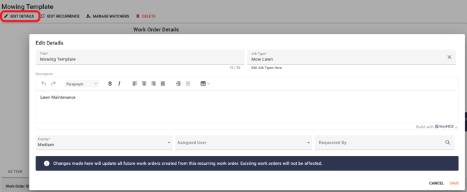 Note: Changes will only affect future work orders. If you need to edit an existing work order, open and edit that work order directly.