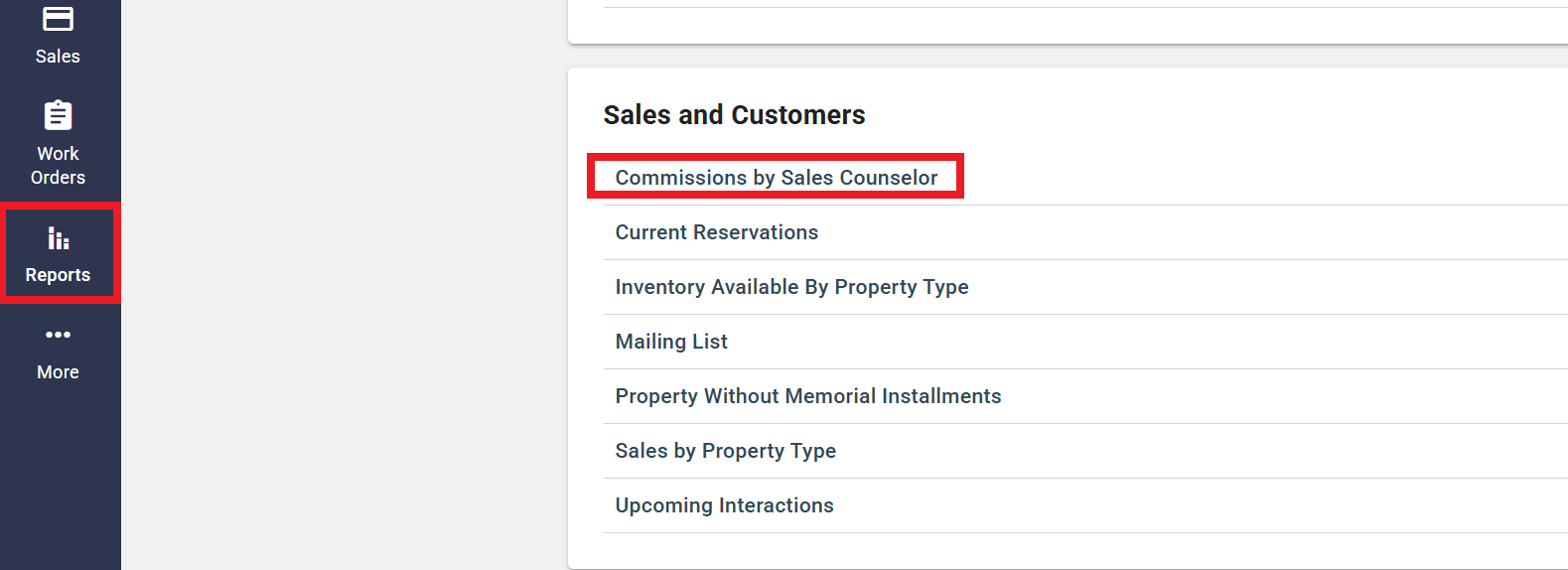 To run a report and track commissions, visit the Reports tab and select the Commissions by Sales Counselor report.